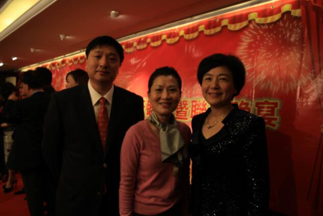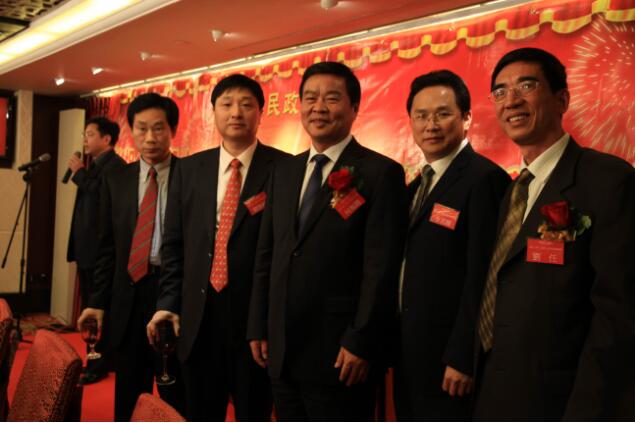 图为湖南省人民政府副省长何报翔(左一)与三湘集团有限公司董事长刘胜辉(左二)及夫人余辉女士(左三)在迎新联谊会上。