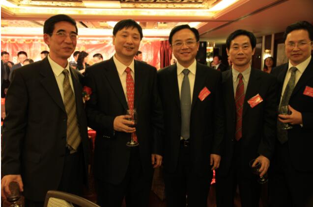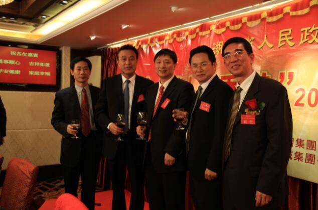图为香港中国企业协会总裁冯洪章先生(左二)与三湘集团有限公司班子成员刘胜辉、郭学驰、李其辉、刘任在迎新联谊会上合影。