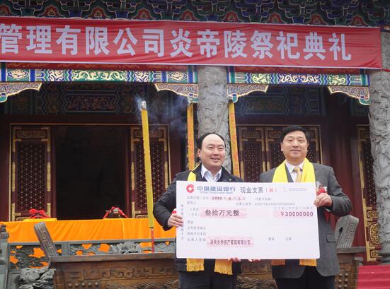 在肃穆庄严的气氛中,主祭人刘胜辉董事长恭读了《祭炎帝文》,在颂扬中华始祖丰功伟绩的同时,也表达了公司励精图治、发展壮大的信念。读毕, 刘胜辉董事长将帛书置于香炉中焚化。为支持炎帝陵建设,刘胜辉董事长还代表湖南炎帝资产管理有限公司捐款30万元。