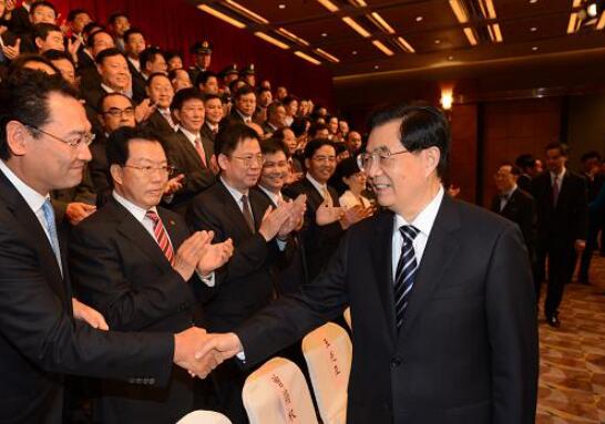 图为胡锦涛主席与中央驻港机构和主要中资机构负责人亲切握手。