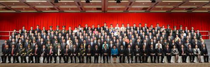 图为胡锦涛主席与中央驻港机构和主要中资机构负责人会见时合影。(刘胜辉董事长位于四排左起第三)