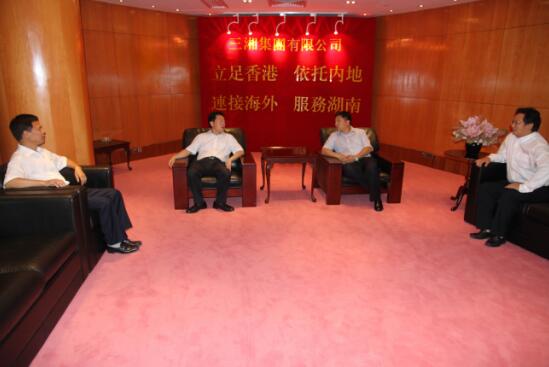 8月21日,长沙市委常委、市统战部长文树勋、市人民政府副市长何寄华借出席在香港举行的“香港长沙商会成立暨长沙市重大项目推介会”活动之际,在中联办经济部孙湘一副部长陪同下,率市人民政府顾问黎勇、市委统战部副部长王国平、饶福明、市轨道交通集团监事会主席吴四龙等一行13人到访三湘集团有限公司香港总部,三湘集团有限公司董事长刘胜辉、副总经理李其辉、总经理助理余大红、薛清等出席会见活动。