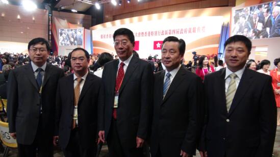 图为湖南省委副书记、省长徐守盛(中)率湖南省政府代表团成员湖南省人民政府秘书长戴道晋(左四)、湖南省人民政府港澳事务办公室主任肖祥清(左二)、湖南省人民政府办公厅副主任王华平(左一)、三湘集团有限公司董事长刘胜辉(左五)在庆祝香港回归祖国15周年大会暨香港特别行政区第四届政府就职典礼上合影。