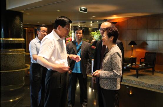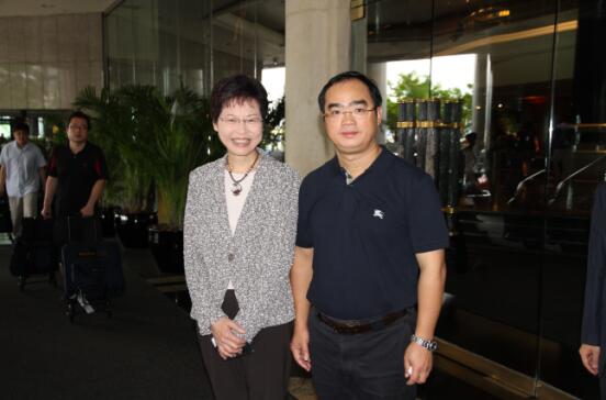 香港特区政务司司长林郑月娥女士(右)专程赶到酒店,送别由省长徐守盛(左)率领的湖南省政府代表团一行。