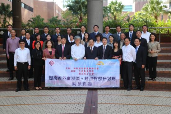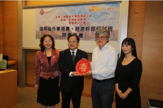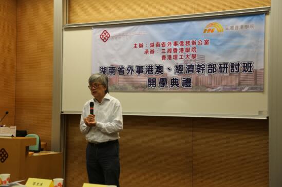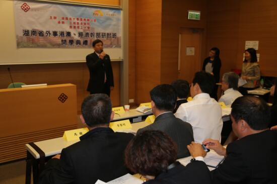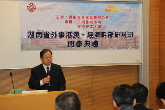 10月22日上午,由三湘香港学院和香港理工大学承办的湖南省外事港澳、经济干部研讨班在香港理工大学举行了隆重的开学典礼。中央人民政府驻香港联络办公室经济部副部长孙湘一、湖南省外事侨务办公室副主任黎里溪、香港理工大学公共政策研究所所长兼中国商业中心主任陈文鸿博士以及三湘集团有限公司董事长、三湘香港学院执行负责人刘胜辉作为主礼嘉宾出席了开学典礼。