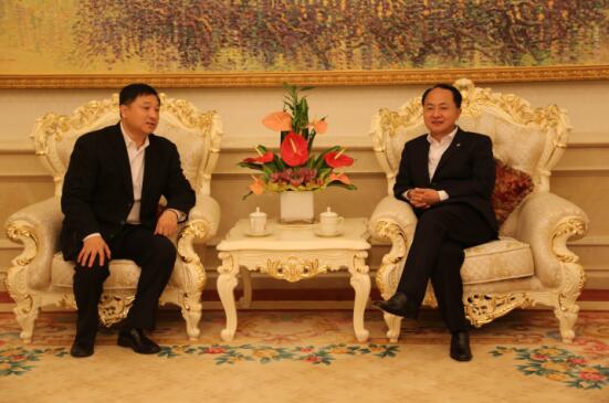 图为香港中联办经济部王丙辛部长(左)和刘胜辉董事长(右)在亲切交谈。