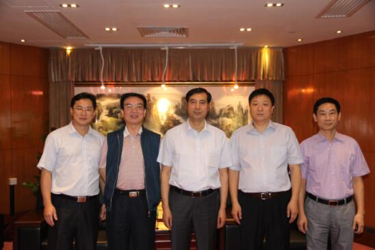 省国资委副主任樊建军(中)、湖南财信投资控股有限责任公司书记朱德光(左二)和三湘集团有限公司刘胜辉董事长(右二)、郭学驰副总裁(右一)、李其辉副总裁(左一)亲切合影。