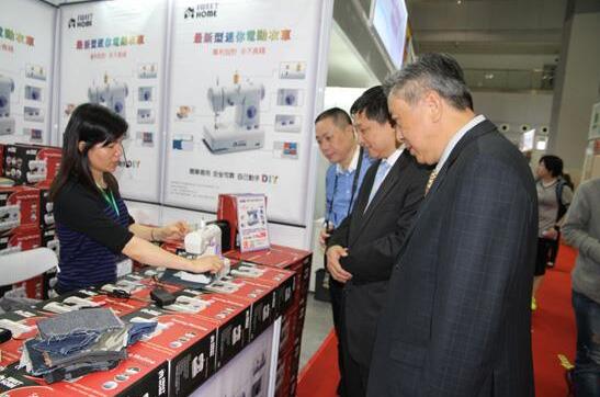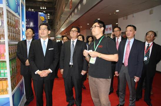 三湘集团有限公司董事长、总裁刘胜辉(左一)陪同香港商务及经济发展局局长苏锦梁(左二)一行参观工展会现场。