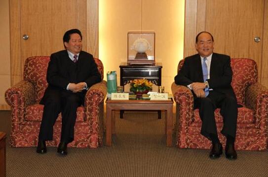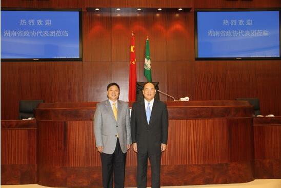 5月9日上午, 湖南省政协主席陈求发一行在三湘集团有限公司董事长、总裁刘胜辉陪同下专程拜访澳门立法会,澳门立法会主席贺一诚热情接待了陈求发主席一行。在双方会见中,贺一诚主席介绍了澳门立法会在监督澳门特区政府施政及促进民生方面的作用,同时陈求发主席也向贺一诚主席及议员介绍了湖南省经济社会发展的最新状况,并希望澳门立法会在 “法制湖南”建设方面给予支持并出谋献策。双方就澳湘两地之间进一步的合作交流进行了热烈的探讨。