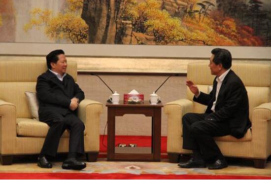 湖南省政协主席陈求发(左)与澳门中联办主任李刚(右)亲切交谈。