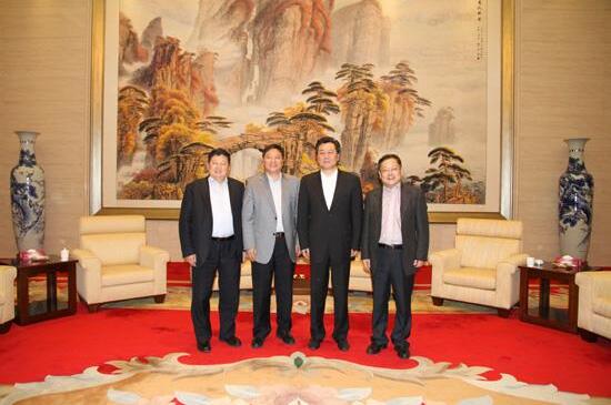 澳门中联办主任李刚(右二),湖南省港澳办副主任黎里溪(右一),长沙市政协主席范小新(左一)和三湘集团有限公司董事长、总裁刘胜辉亲切合影。