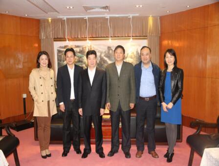 湖南省商务厅副厅长罗双锋(左三),湖南省商务厅台港澳处处长郑哲(右二),湖南省商务厅投资管理处处长王庭恺(左一),湖南省商务厅承接产业转移处处长尹荻菲(右一)与集团公司董事长、总裁刘胜辉(右三)及副总裁李其辉(左二)亲切合影。
