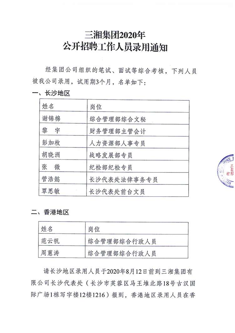 公开招聘工作人员录用通知
