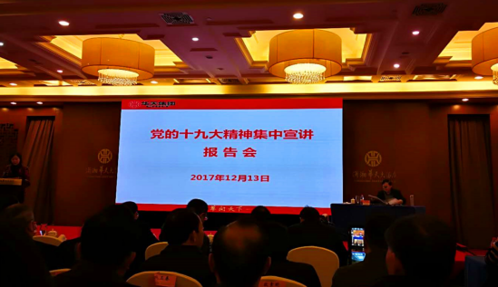 12月13日上午,党的十九大精神集中宣讲报告会在长沙潇湘华天隆重举行。宣讲报告会由省委和省国资委统一部署,省国资委宣群处处长岳倩如主持,中共湖南省委讲师团巡视员、教授陈志强进行现场宣讲。华天集团、兵器集团、三湘集团300余名党员于现场聆听了报告。