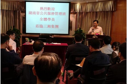 11月1日上午,三湘香港学院院长、三湘集团董事长刘胜辉在集团公司总部三十七楼会议室,以“粤港澳大湾区建设对湖南创新开放的影响”为题,为湖南省第十四期湖南公共服务管理研讨班进行现场授课。该研讨班由省人民政府办公厅副主任周义祥带队,湖南省直相关各单位以及高校共34名干部参加。此次专题授课由集团公司总裁李其辉主持。