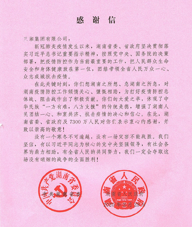 近日,集团收到一封来自疫情防控一线的《感谢信》。信中表达了中共湖南省委、湖南省人民政府对三湘集团在抗击疫情期间所做贡献的感激之情。