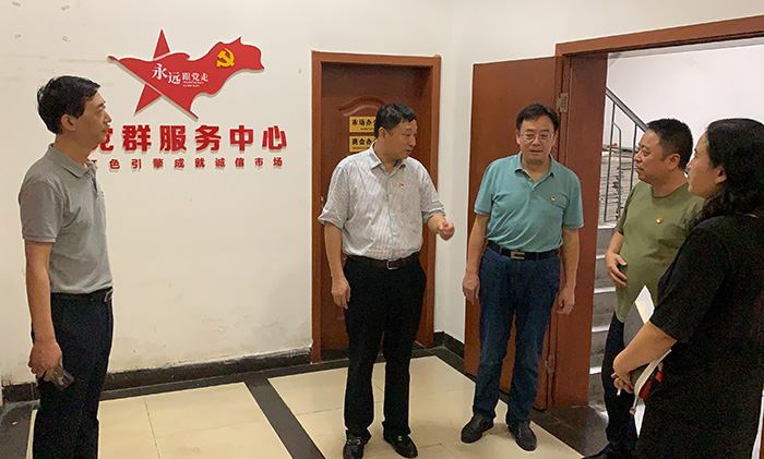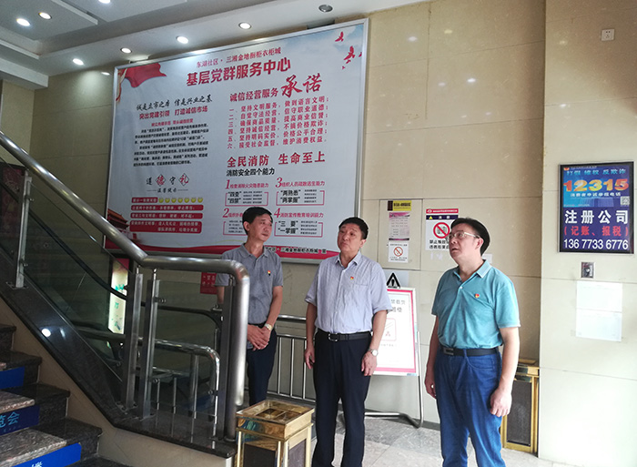 图为公司党委书记刘胜辉、副书记李斌一行到省纺公司所属的三湘金地橱柜衣柜城党员示范岗督查。