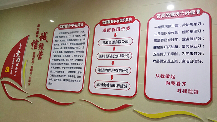 遵照湖南省国资委“党员先锋行”指导精神和三湘集团党委统一部署,中共湖南省纺织品进出口有限公司支部委员会在公司二级单位湖南泰时房地产开发有限公司旗下三湘金地橱柜衣柜城设立了“基层党群服务中心。”